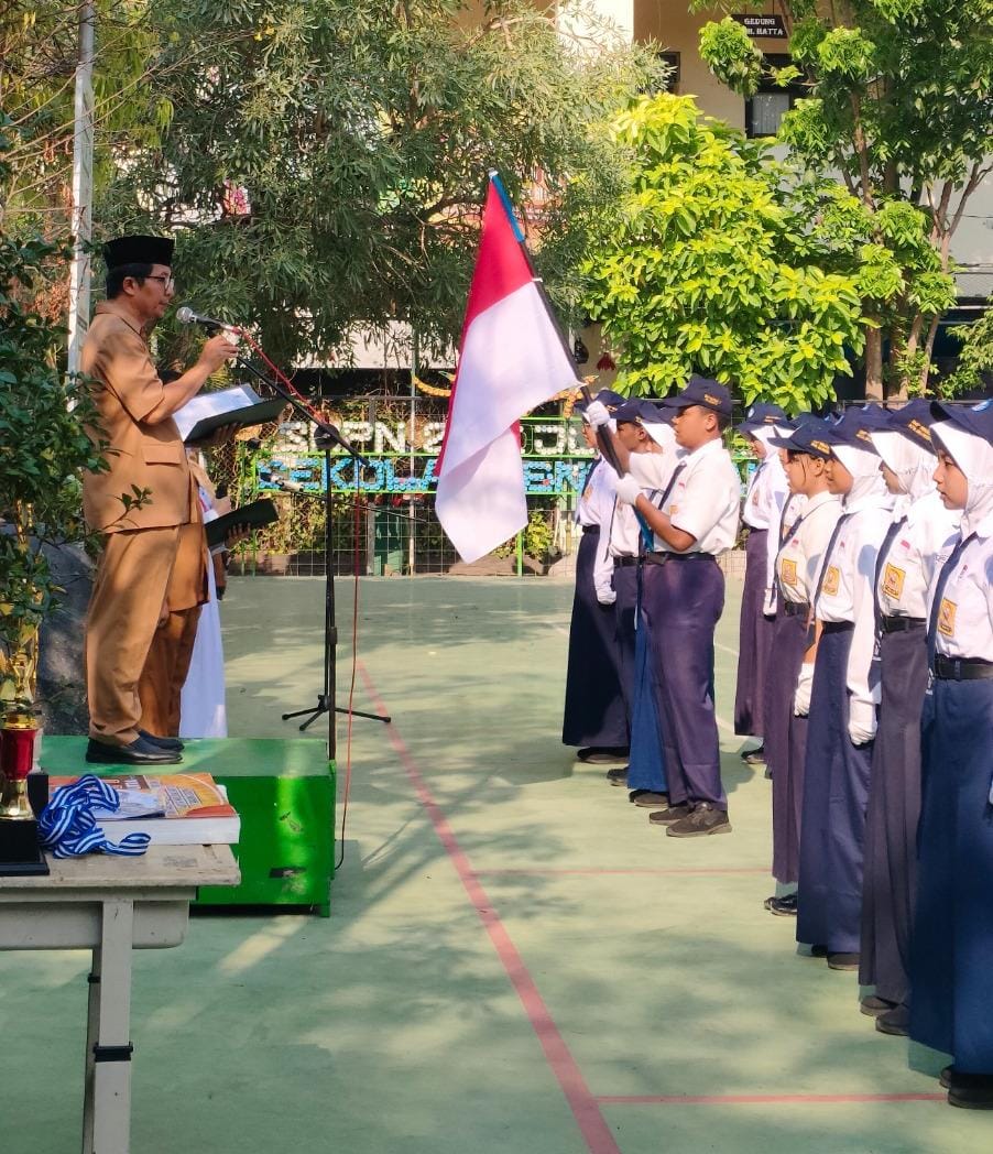 Acara dilanjutkan dengan pembacaan surat kepala sekolah oleh Bu Linda selaku petugas upacara. Pengurus OSIS dan duta sekolah menirukan ikrar yang dibacakan kepala sekolah dengan hikmat. Pak Mulib, Kepala sekolah lalu menyematkan selempang Ketua OSIS kepada Ketua OSIS masa bakti 2024/2025.