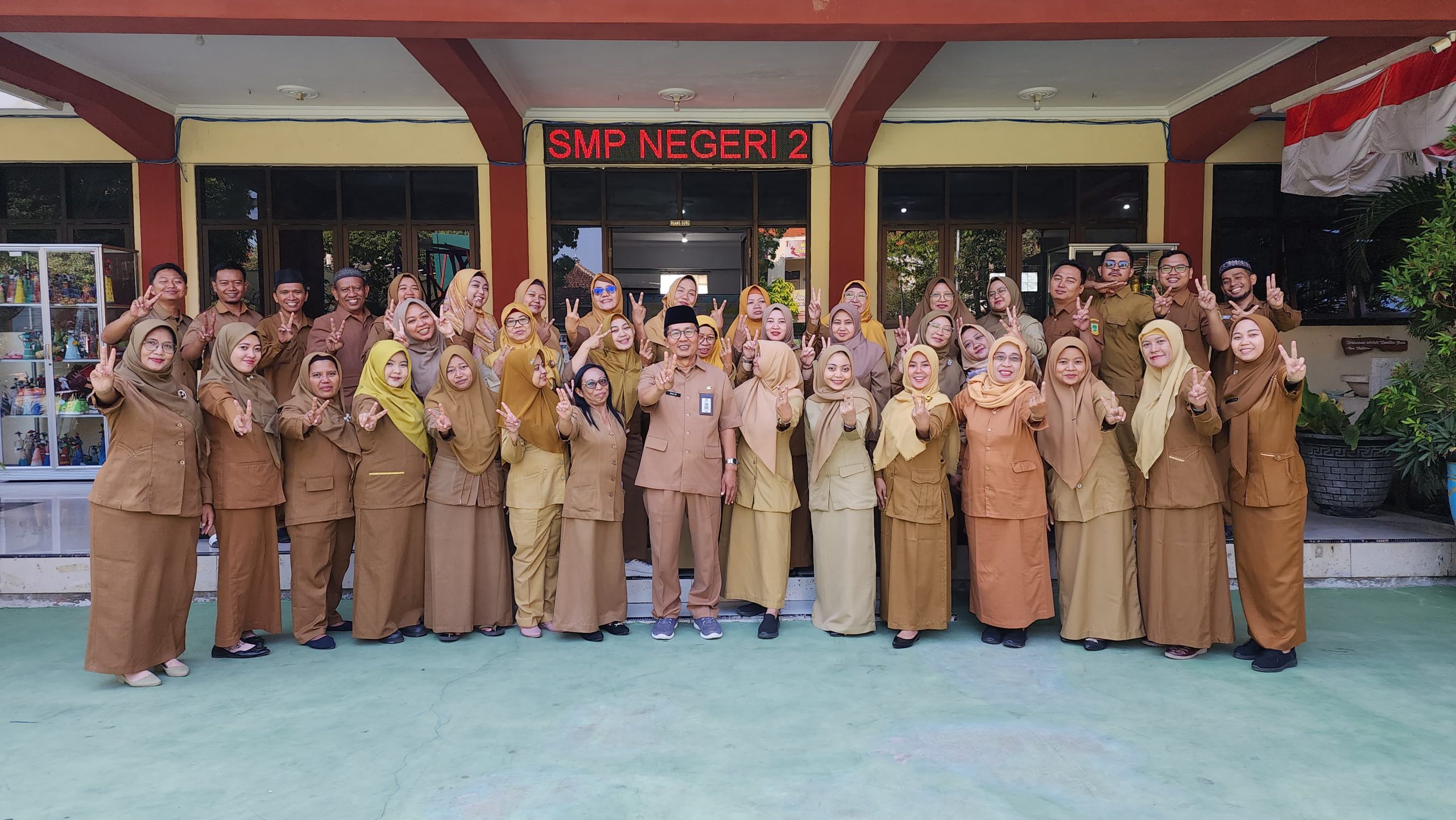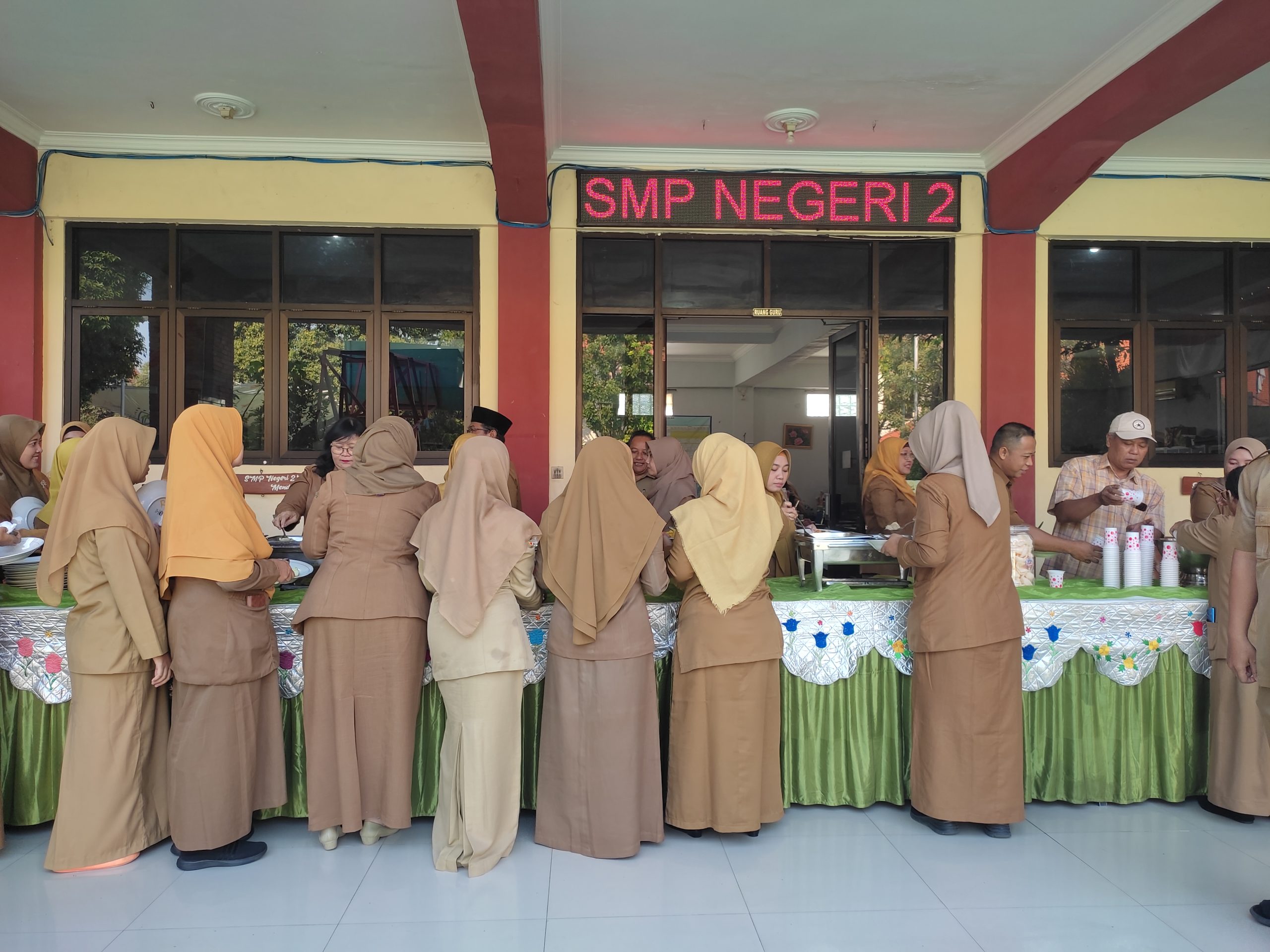 Sebelum peserta didik masuk sekolah, bapak-ibu guru dan segenap karyawan SMP Negeri 2 Mojokerto mengikuti kegiatan Halal bi Halal di sekolah. Terlebih dahulu mereka berkumpul di ruang guru untuk mendengar sambutan dari kepala sekolah.