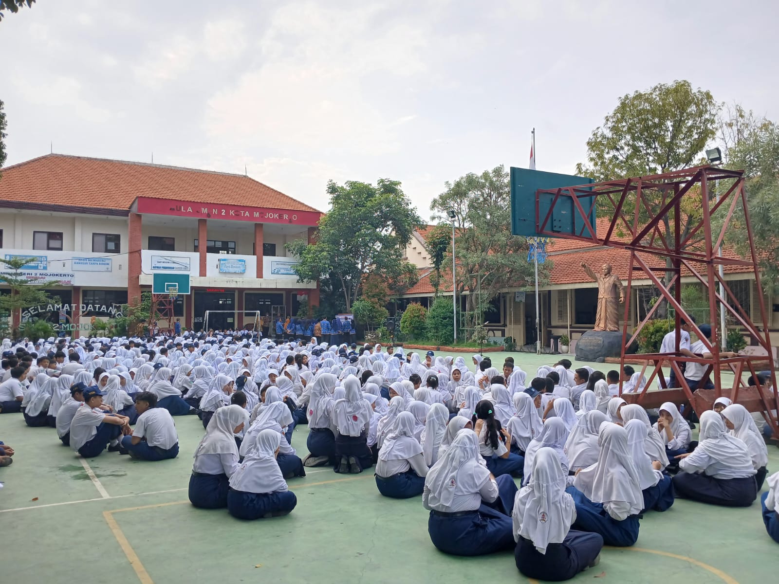 Seluruh warga SMP N 2 Mojokerto berkumpul di lapangan untuk mengikuti apel pagi. Peserta didik mengikuti apel pembukaan kegiatan P5 sekaligus Sosialisasi Komitmen Sekolah menuju Zona Integritas Wilayah Bebas Korupsi (WBK) dan Wilayah Birokrasi Bersih dan Melayani (WBBM).