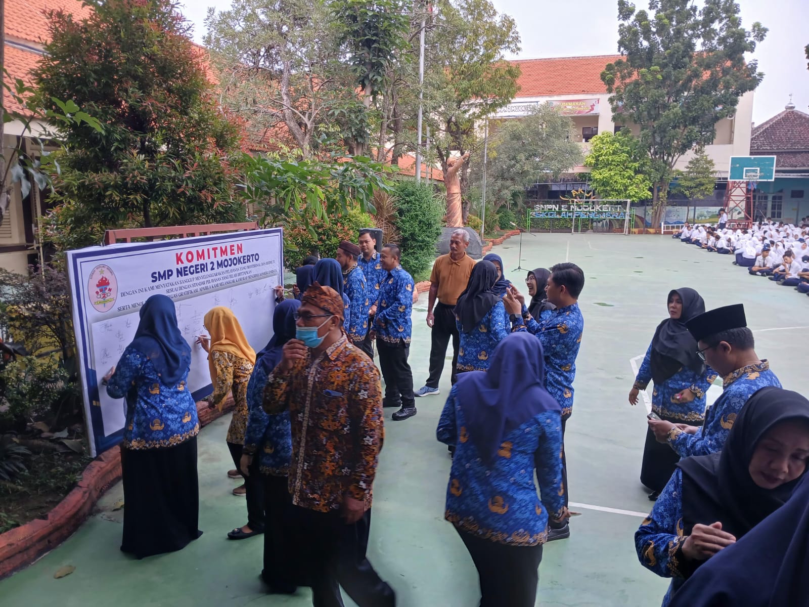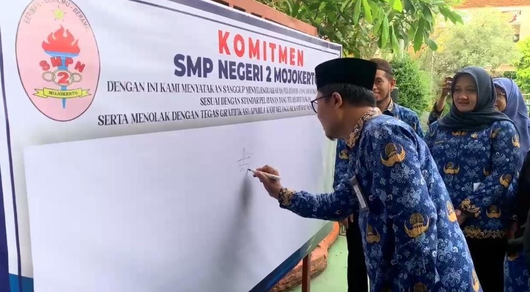 Setelah membuka kegiatan P5, Pak Mulib, kepala sekolah SMP N 2 Mojokerto menandatangi komitmen SMPN 2 Mojokerto menuju Zona Integritas Wilayah Bebas Korupsi. Diikuti bapak-ibu guru beserta peserta didik. (Fifin Misfasiroh)