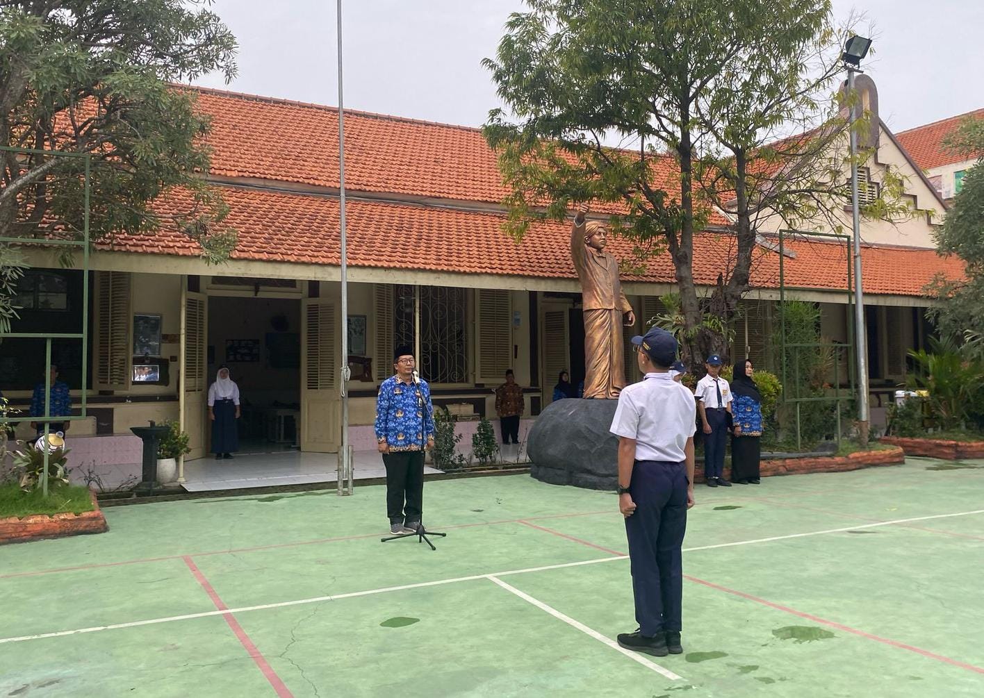 Siswa berbaris rapi dengan memakai atribut lengkap. Pak Mulib selaku pembina apel menyampaikan pengarahan mengenai pentingnya pembelajaran P5 bagi peserta didik.