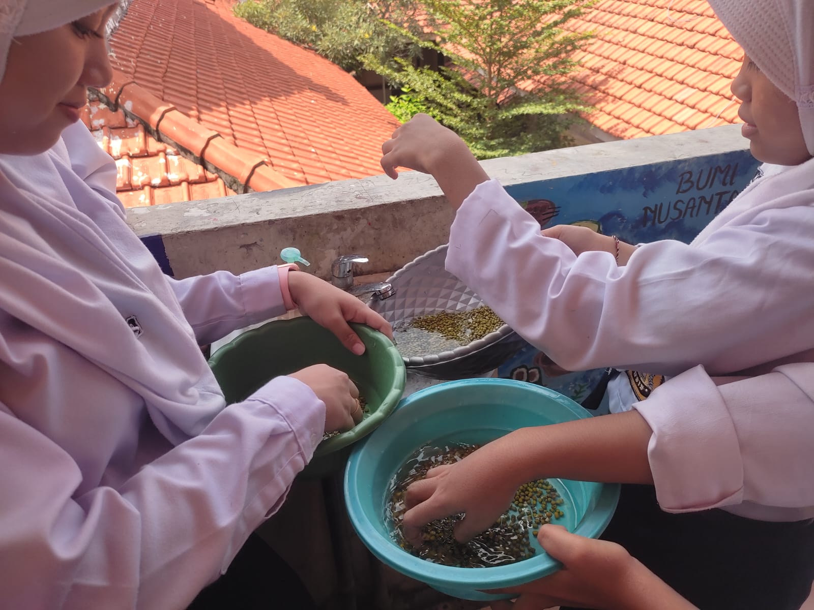 Pada jam ketujuh, peserta didik mencuci dan merendam kacang hijau yang akan ditanam di media Hidroponik. Anak-anak dapat melakukannya di tempat wudhu atau wastafel. Terakhir, mereka merangkum materi hari ini dan menulis refleksi kegiatan P5.