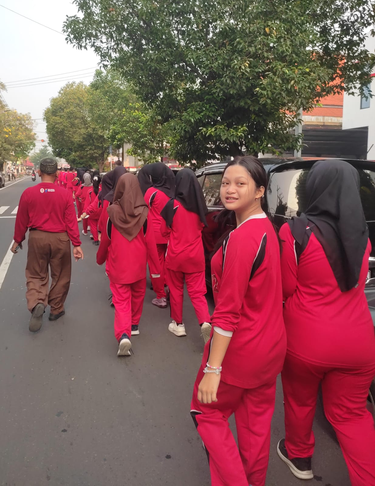 Peserta didik memakai baju olahraga berkumpul di lapangan sesuai kelas masing-masing. Bapak-ibu wali kelas mendampingi mereka. Anak-anak berjalan dua anak berbaris untuk mengikuti jalan sehat. Mereka antusias sekali karena bisa berolahraga sekaligus melihat lingkungan sekitar sekolah.