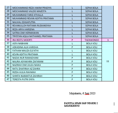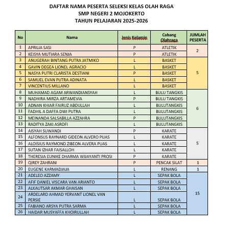 Daftar Nama Peserta Seleksi Kelas Olahraga UPT SMP Negeri 2 Mojokerto, tahun pelajaran 2025/2026.