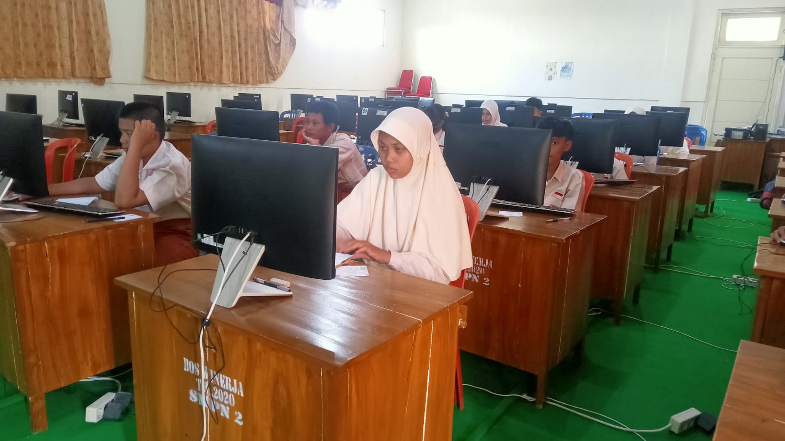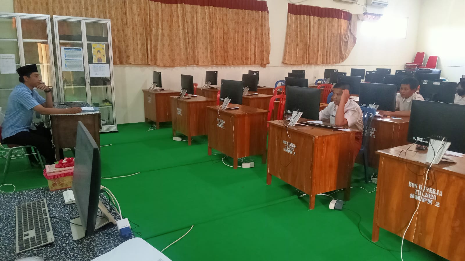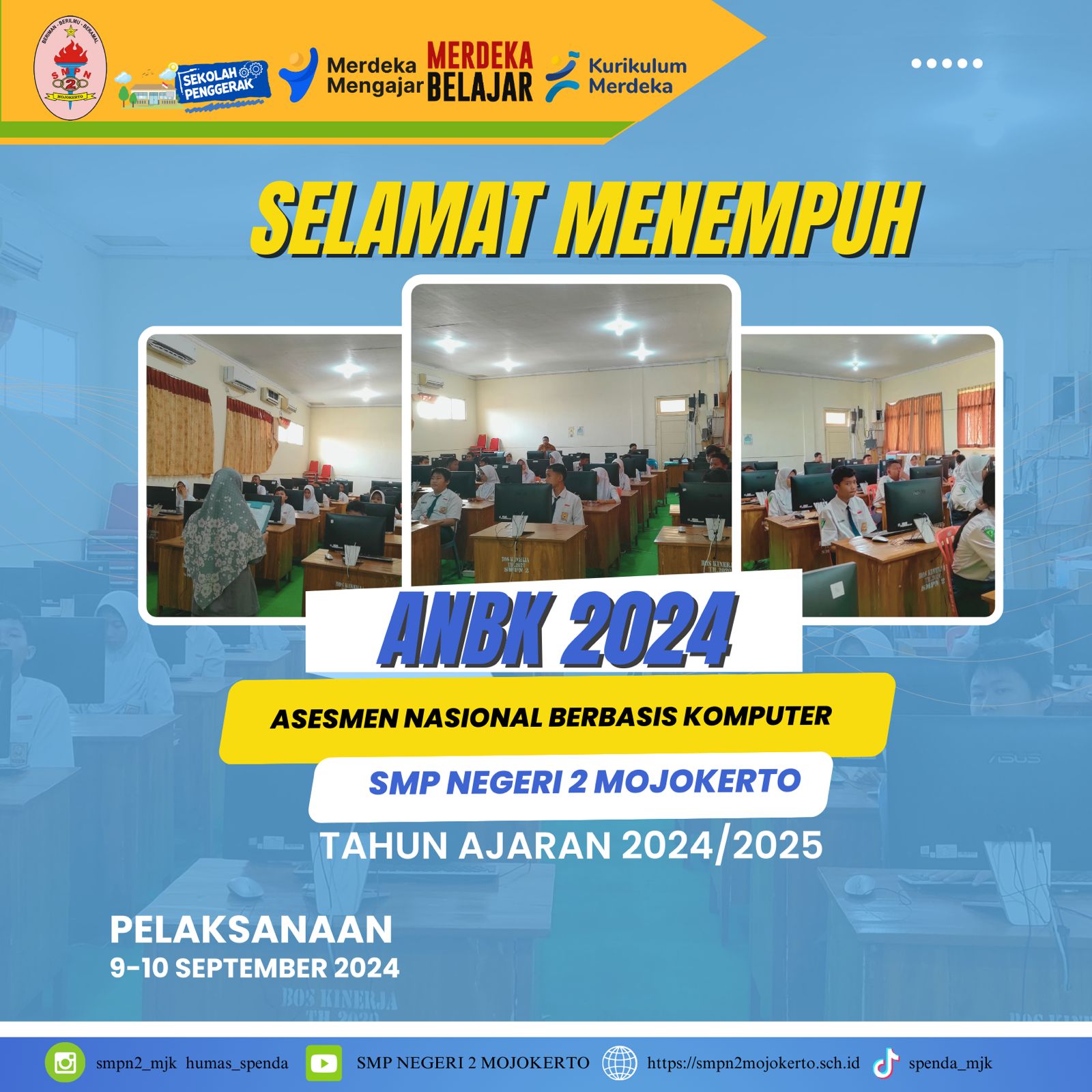 Siswa kelas 8 SMP Negeri 2 Kota Mojokerto mengikuti ANBK di Lab Komputer. Kegiatan tersebut dibagi menjadi dua sesi yakni sesi pagi jam 07.00-09.30 dan sesi siang jam 10.15-12.00. Kegiatan ini berlangsung selama dua hari, Senin dan Selasa. Mereka didampingi Pak Syaiful sebagai proktor dan Pak Wahyu sebagai teknisi. Pengawas ANBK dari sekolah SMP IT Permata.