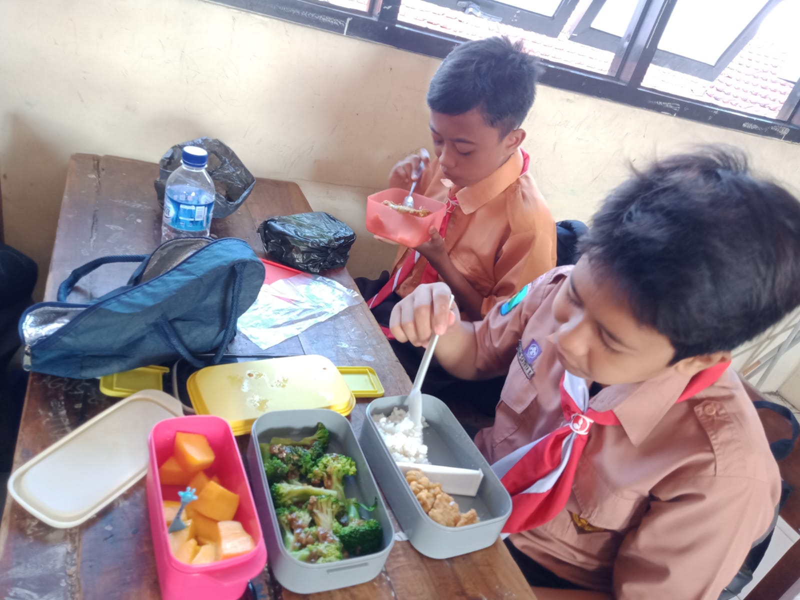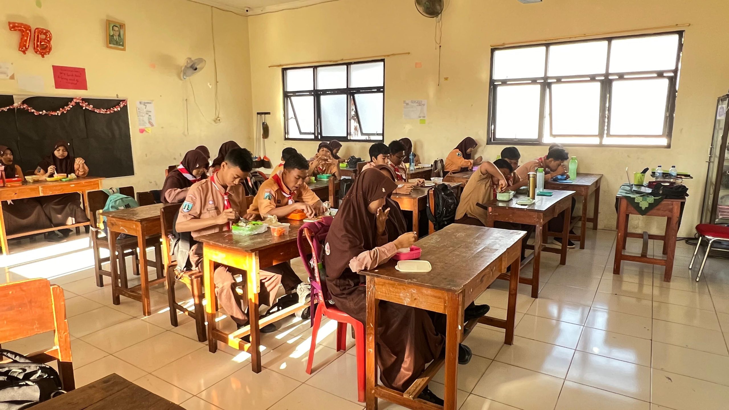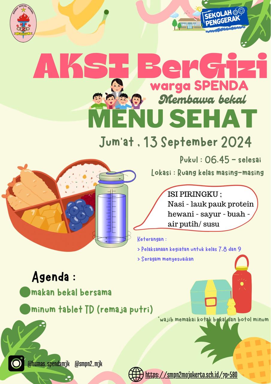 Jumat pagi, siswa-siswi SMPN 2 Kota Mojokerto mengikuti Aksi Gizi di sekolah. Peserta didik dari rumah membawa bekal bergizi, berisi lauk pauk protein hewani, sayur, buah, air putih atau susu. Bu Berliana selaku petugas UKS berkeliling ke tiap kelas memberi pengarahan serta pil penambah darah untuk remaja putri, demi mencegah dan mengatasi anemia.