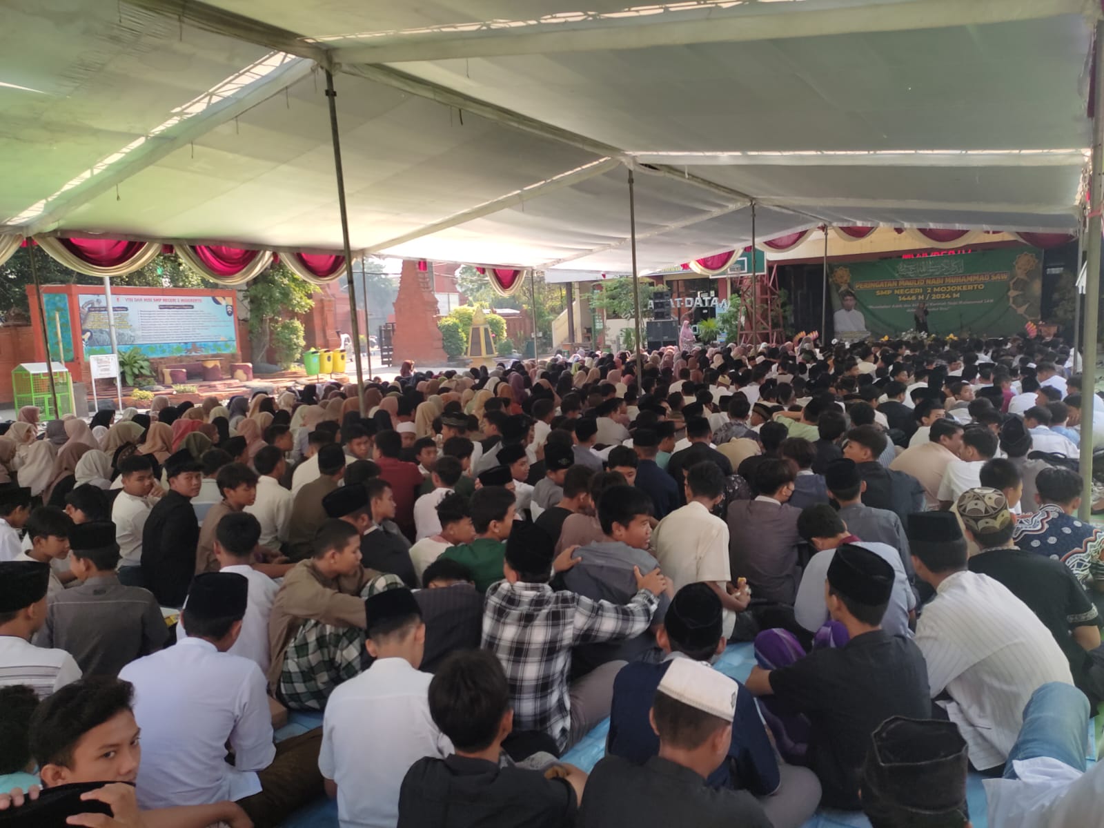 Ada yang berbeda pagi ini, siswa-siswi SMP Negeri 2 Mojokerto memakai baju gamis, sarung dan kopiah. Mereka mengikuti “Peringatan Maulid Nabi Muhammad” dengan tema “Meneladani Adab dan Akhlakul Karimah Nabi Muhammad SAW dalam Menuntut Ilmu”. Sebelumnya anak-anak berada di kelas mengikuti literasi rohani didampingi wali kelas masing-masing. Mereka lalu mengumpulkan handphone di ruang guru.
