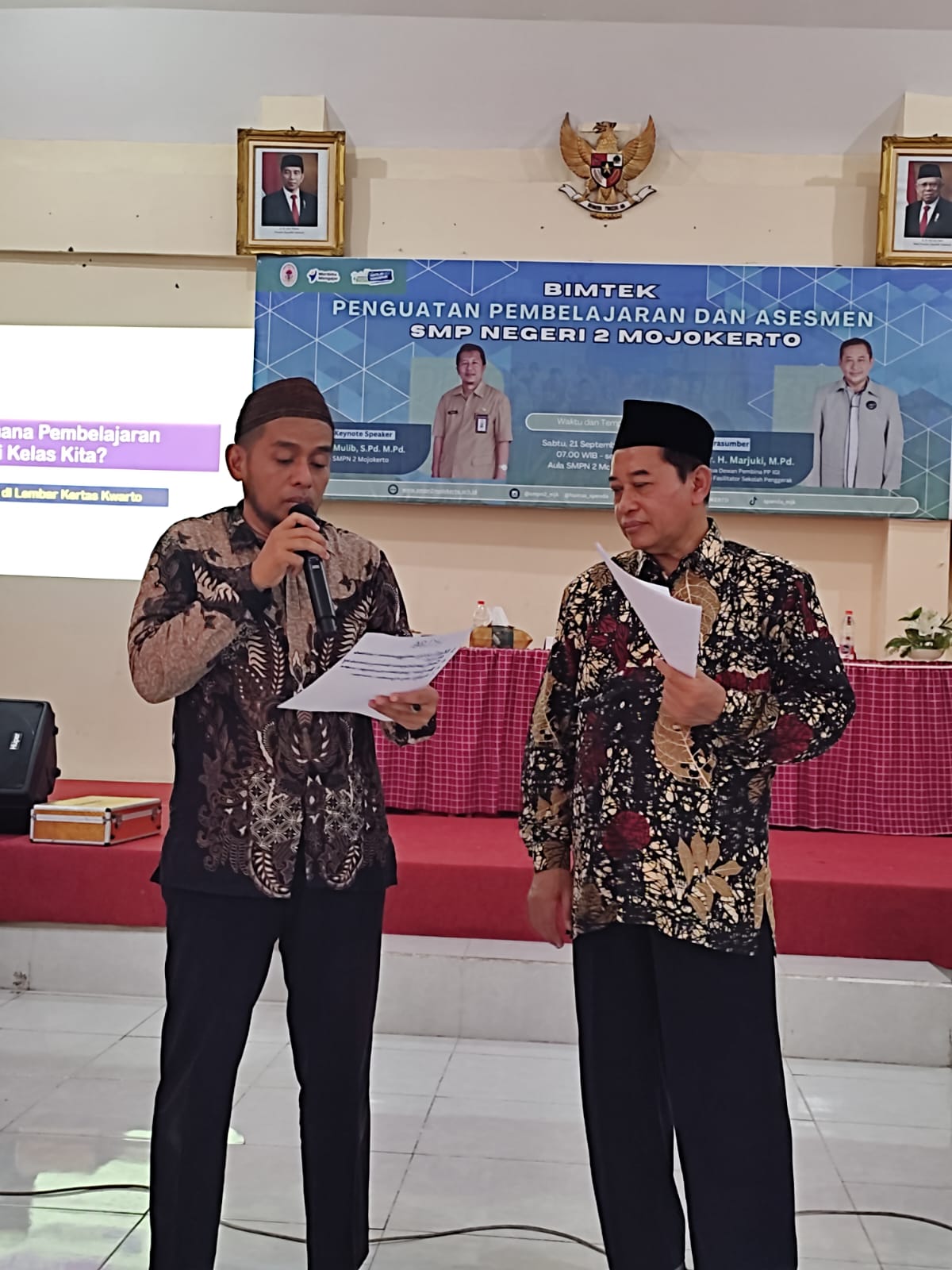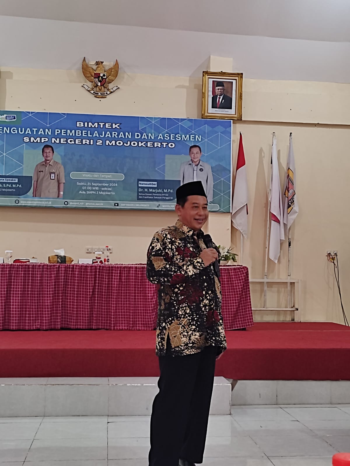 Sabtu pagi, bapak-ibu guru mengikuti kegiatan Bimtek : Penguatan Pembelajaran dan Asesmen. Narasumber untuk acara ini Bapak Dr. Marjuki, M.Pd, Kegiatan dilaksanakan di aula SMP Negeri 2 Mojokerto.