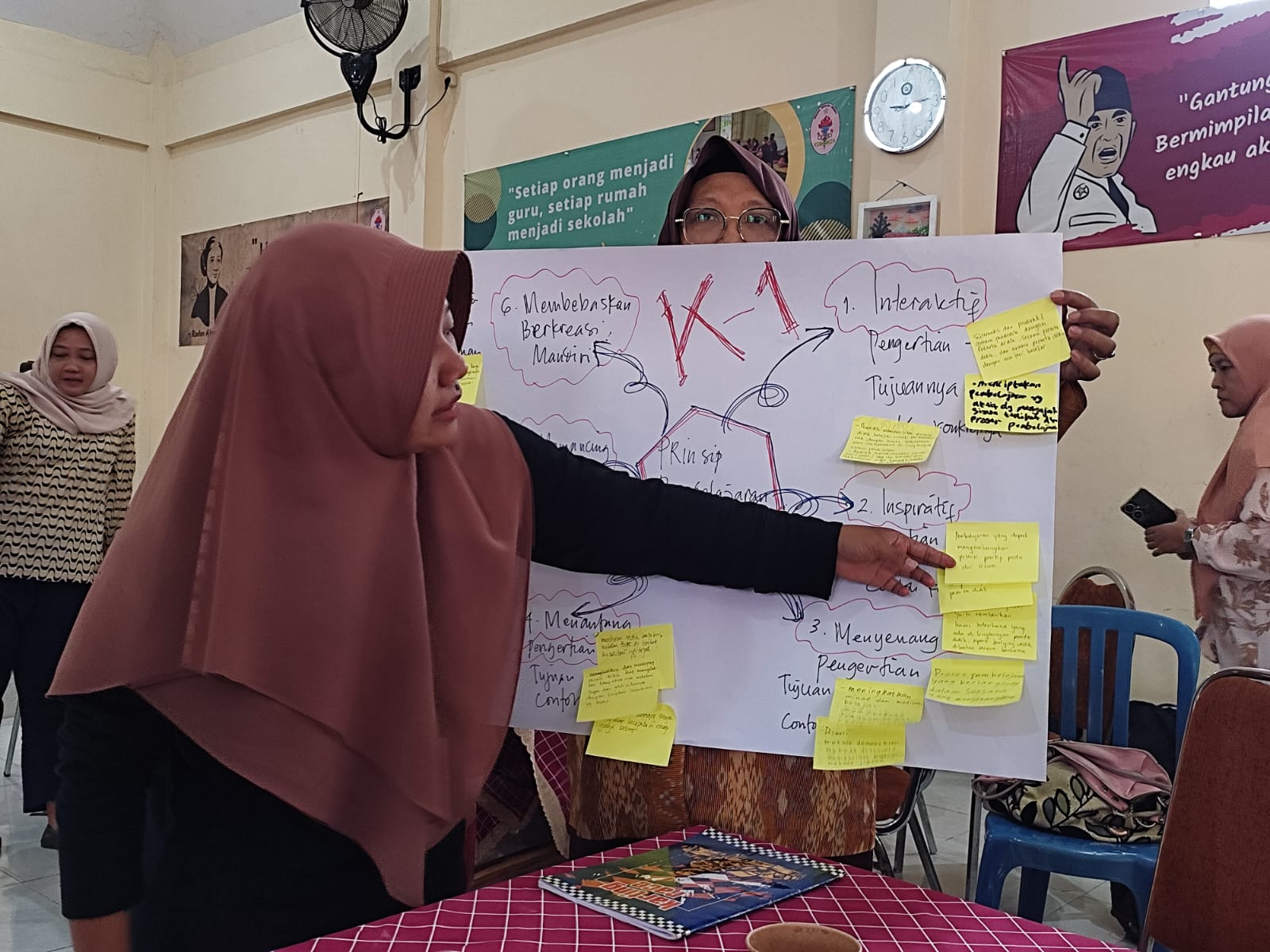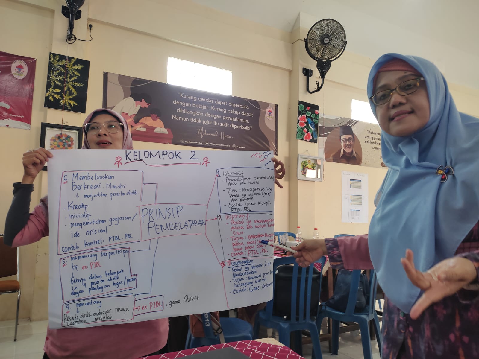 Kemudian, guru-guru dibagi menjadi kelompok kecil. Sebanyak lima grup terdiri dari 5 orang. Mereka diminta menulis pendekatan dan definisi prinsip pembelajaran, memberikan pengertian, tujuan dan contoh konkret. Lalu, hasilnya dipresentasikan kepada kelompok lain, berkeliling dan anggota kelompok diperbolehkan bertanya.